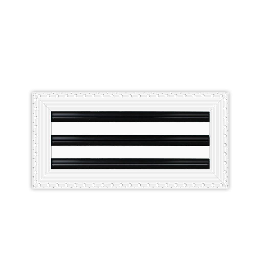 • Texas Buildmart offers Mud In Air Vent Covers also known as Drywall Mud-in White Air Vents. This Mud In Air Vent Cover shoots a 90-degree spread with option to adjust to one side or the other. These have decorative directional dampers. Modern, crisp, clean lines and architecturally appealing. Solid extruded aluminum profile, expertly welded, grinded, and sanded, with reinforcement brackets on the back and a uniform coat of electrostatic paint for a sleek, modern finish and easy maintenance. This white air vent register can be used as a supply air vent cover for ceilings and walls and as a return air vent cover register but looks like a Luxury Drywall Mud-in Vent Cover. If our Mud In Air Vent Cover is used as a Return air vent cover, please make sure the air vent cover is placed in the full open position or remove the directional dampers. Update your Ceiling and Wall Vents with our Mud In Air Vent Covers and it will update the entire look of your Home or Office Space. Rejillas para aire acondicionado de casa blanco. We make all sizes from 6x4 to 30x24 Modern Mud Air Vent Covers for the Modern Day Home. *This is a Design and Utility Patent Pending Product*