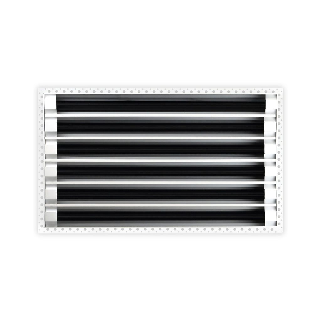 • Texas Buildmart offers Mud In Air Vent Covers also known as Drywall Mud-in White Air Vents. This Mud In Air Vent Cover shoots a 90-degree spread with option to adjust to one side or the other. These have decorative directional dampers. Modern, crisp, clean lines and architecturally appealing. Solid extruded aluminum profile, expertly welded, grinded, and sanded, with reinforcement brackets on the back and a uniform coat of electrostatic paint for a sleek, modern finish and easy maintenance. This white air vent register can be used as a supply air vent cover for ceilings and walls and as a return air vent cover register but looks like a Luxury Drywall Mud-in Vent Cover. If our Mud In Air Vent Cover is used as a Return air vent cover, please make sure the air vent cover is placed in the full open position or remove the directional dampers. Update your Ceiling and Wall Vents with our Mud In Air Vent Covers and it will update the entire look of your Home or Office Space. Rejillas para aire acondicionado de casa blanco. We make all sizes from 6x4 to 30x24 Modern Mud Air Vent Covers for the Modern Day Home. *This is a Design and Utility Patent Pending Product*